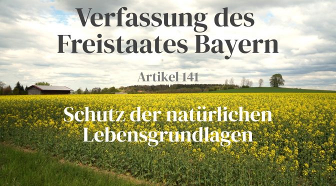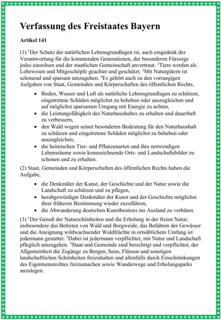(1) 1Der Schutz der natürlichen Lebensgrundlagen ist, auch eingedenk der Verantwortung für die kommenden Generationen, der besonderen Fürsorge jedes einzelnen und der staatlichen Gemeinschaft anvertraut. 2Tiere werden als Lebewesen und Mitgeschöpfe geachtet und geschützt. 3Mit Naturgütern ist schonend und sparsam umzugehen. 4Es gehört auch zu den vorrangigen Aufgaben von Staat, Gemeinden und Körperschaften des öffentlichen Rechts,
